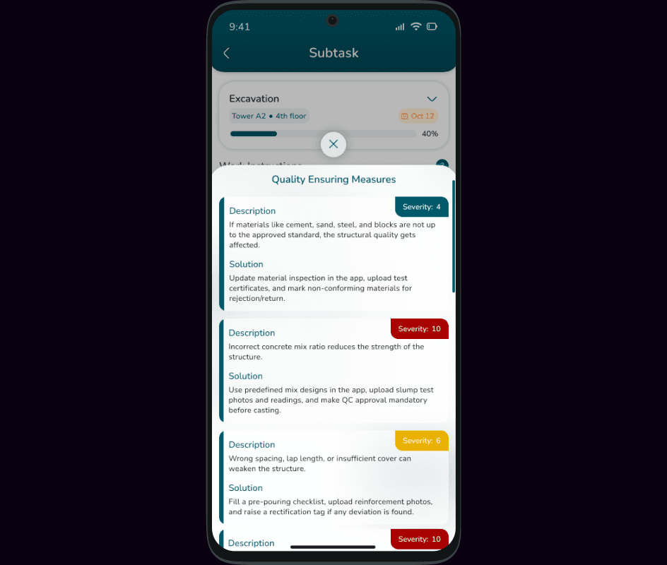 Maintaining quality standards and regulatory compliance across construction projects is challenging with paper-based inspection checklists and manual documentation. Quality issues go undetected until late stages, inspection reports get lost or incomplete, compliance violations risk project shutdowns, rework costs escalate, and proving adherence to standards during audits becomes difficult.